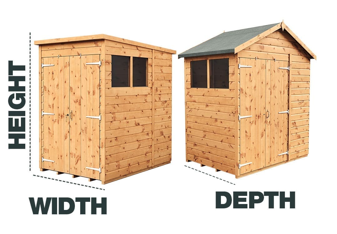 Determine the base width and depth, then measure the highest point of the roof for apex sheds or the slope from the highest to lowest point for pent sheds, ensuring proper clearance for installation. Look out for low hanging trees and the position of your door for easy access.